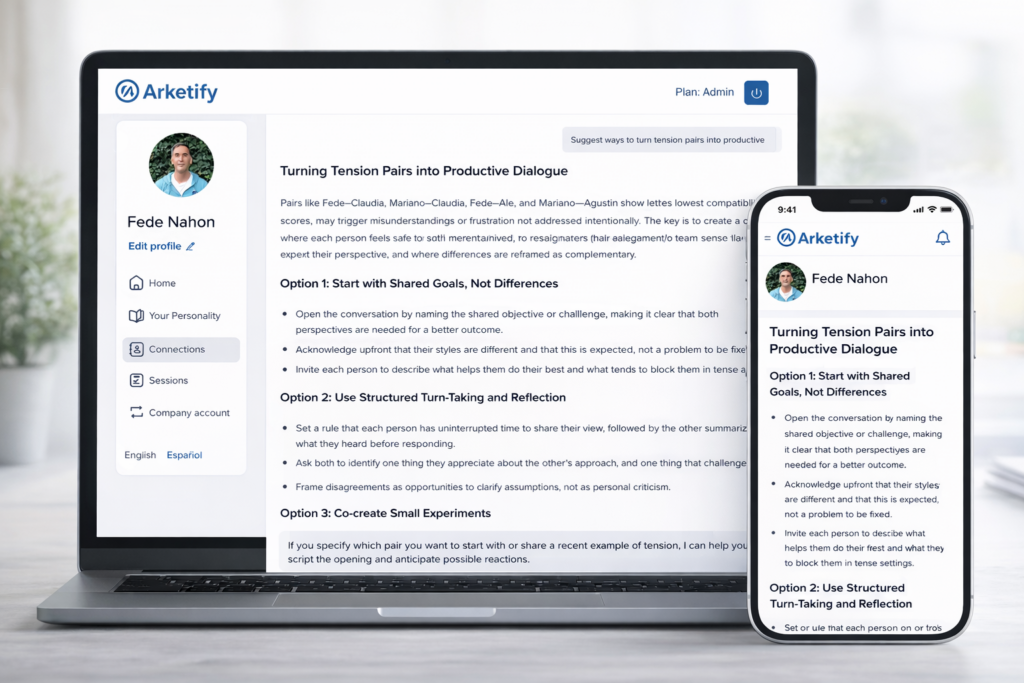 After your team completes a short personality assessment, Arketify makes it easier to understand people and anticipate how dynamics unfold inside a team.